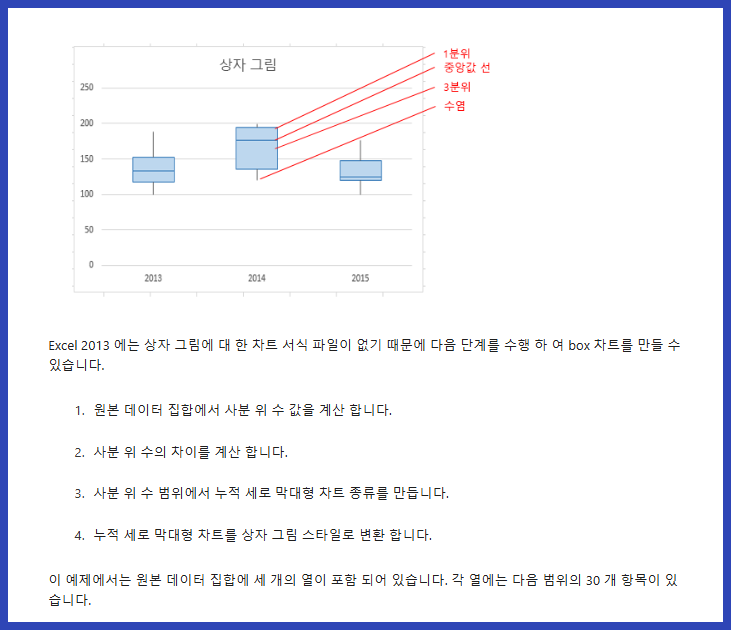 엑셀에서는 자동으로 BOX PLOT 생성이 가능하며, Excel 2016 이상 버전에서 제공되는 차트 옵션 명령으로 활용할 수 있습니다.