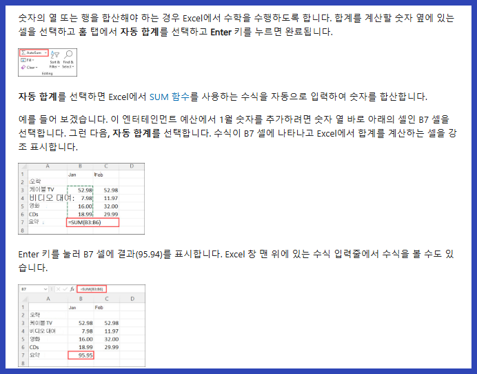 | SUM | 지정된 범위 내 숫자들의 합계를 구합니다. |