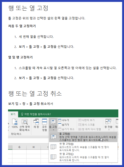 | 행 고정 | 첫 행/열 고정, 여러 행 고정 |