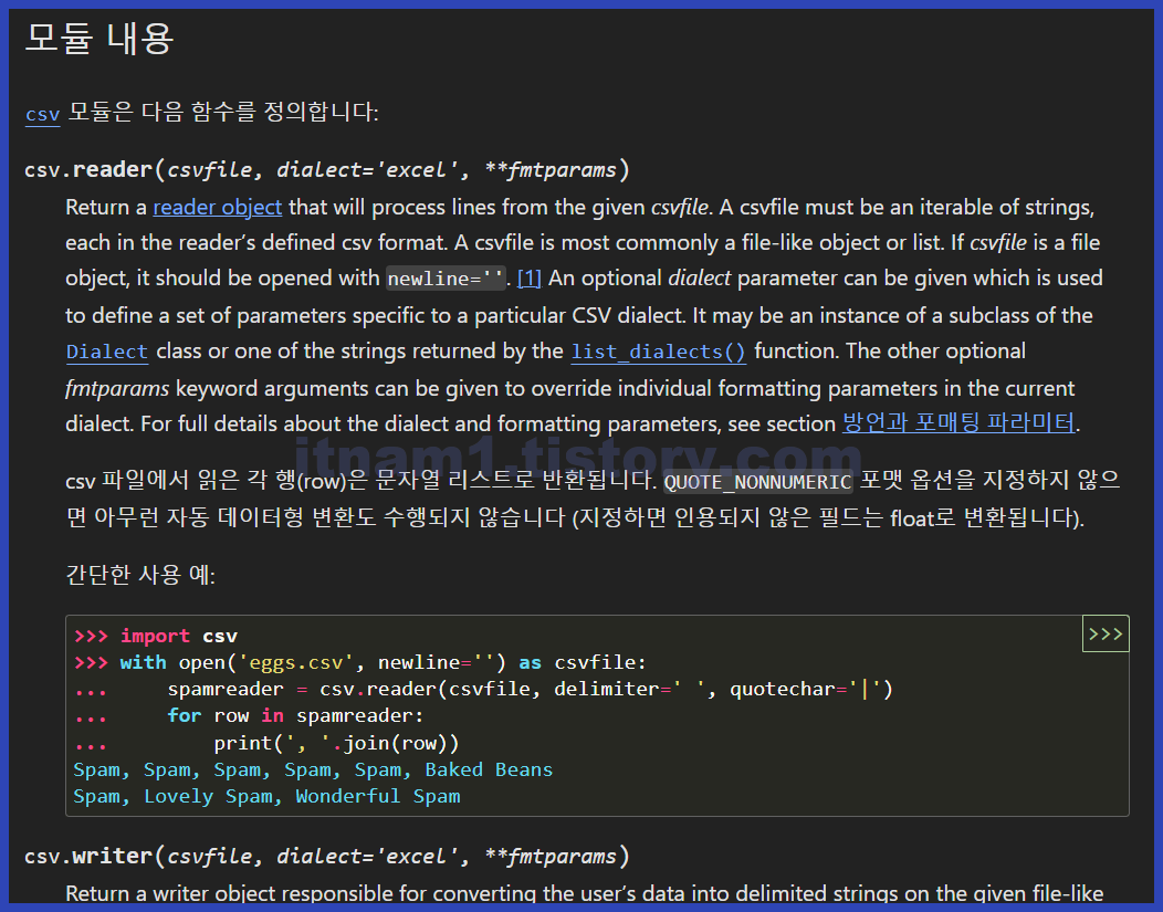 | csv 모듈 | 간단하고 가볍다 | 대규모 데이터 처리 어려움 | 소규모 데이터 처리 |