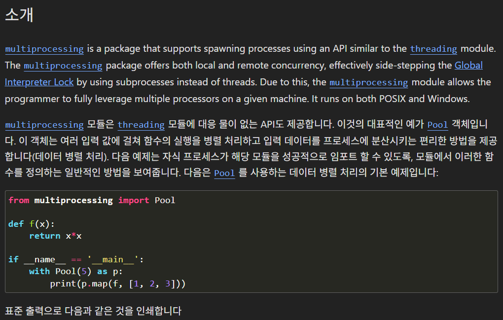 | Pool | map(), apply() | 작업 분배 자동화 | 동일 함수 병렬 처리 |