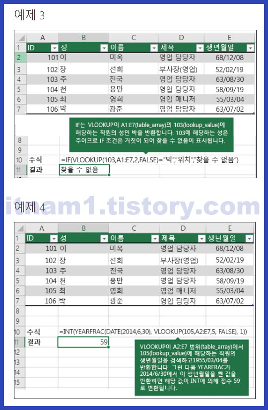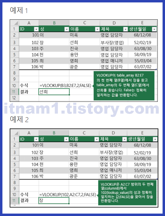 사용 예: =VLOOKUP("직원 ID", A1:D10, 2, FALSE)
